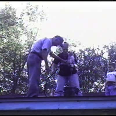 Man cuts down a tree near a trailer house. Tree falls and crushes roof. Men try to turn off electricity and gas lines to the house.