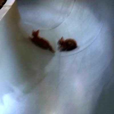 Two young men walk on a powered-off water slide in a pool after two kitten cats have gotten stuck in the slide. The kittens try to jump up the slide but slip back down. A man throws a towel over one of the kittens, while the man behind the camera tosses a box on top of the other as it runs down the slide under the box.