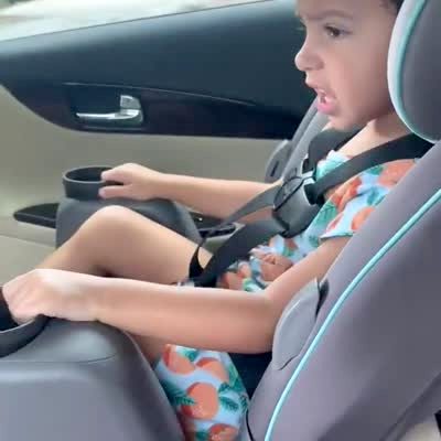 A tot girl in a car seat says, "Stop driving like a maniac."