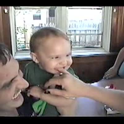 Woman sticks her finger in a baby's mouth. Baby boy bites down hard.