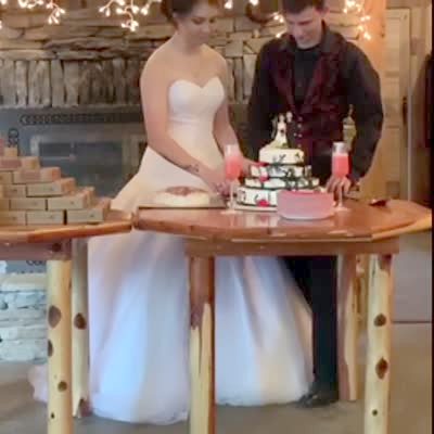 A recently married bride and groom cut the wedding cake together at the reception. The woman smashes her piece into the man's face and both fall to the floor.