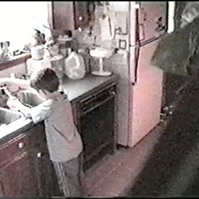 A woman in the kitchen claims she saw something move in the kitchen and her husband jumps onto a chair. After some time, the man cleans the kitchen and screams and runs away when he sees the mouse.