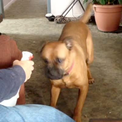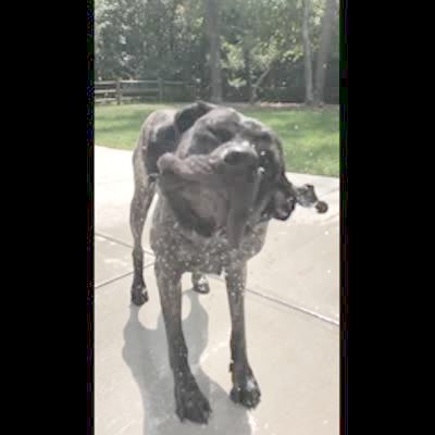 A Mastiff dog bites at a jet of water that a man shoots out of spray bottle at home.