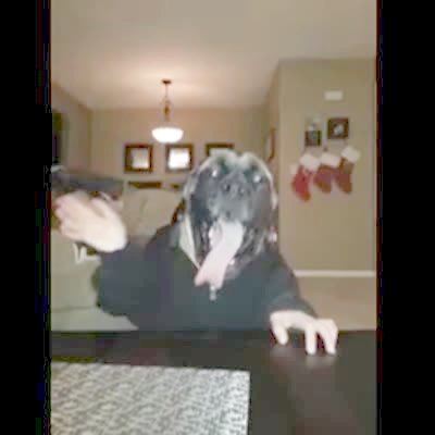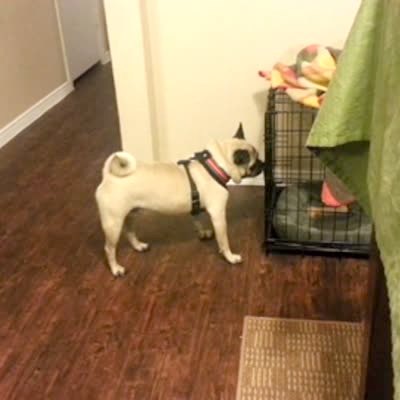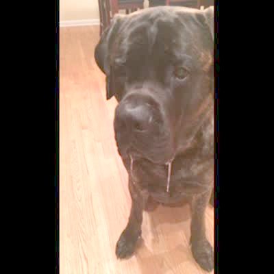 A dog goes to bite the corner of kitchen table and a woman off camera yells at him to stop. The mastiff tilts its head in confusion.
