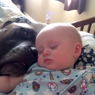 A baby boy sleeps next to a snoring Mastiff dog indoors.