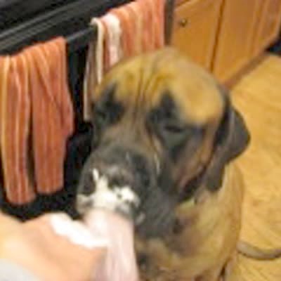 Assignment America dog with hands. An English Mastiff sits at table and waves.