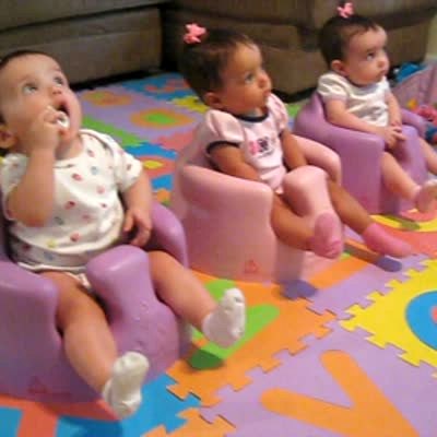 Triplet baby girls sit in matching outfits and matching pink chairs watching a movie in a play room. The person behind the camera pans across the babies and lands on one with wide eyes and a funny expression.