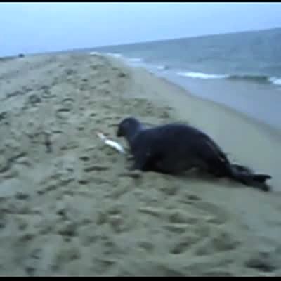 A man reels in a fish on a a beach. A seal flops on the beach, grabs the man's fish off his fishing line, takes it back into the ocean and swims away. No heads. Profanity. No tails.. Fingerprint match in UGC-EP system.