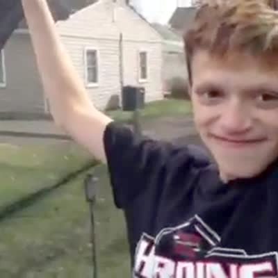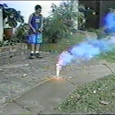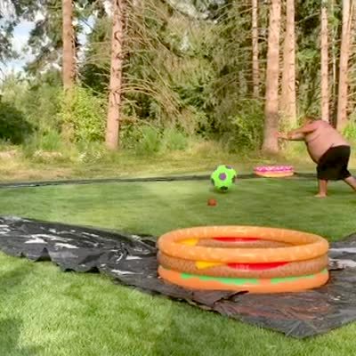 A man lights a pile of leaves drenched in gasoline on fire and it explodes, then he does a backflip in a yard. Security camera footage.