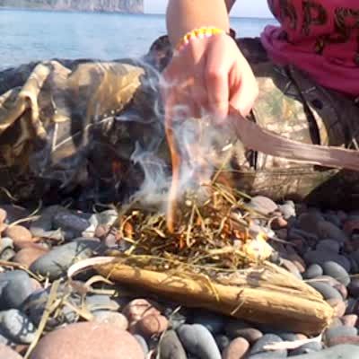 A teen girl lights a small fire on a beach outdoors, catches her pants on fire, screams, and rolls into the water.
