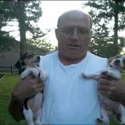 Man holds 2 beagle puppies and tells them to fight. The dogs play fight. He tells them "in your corner!" and they stop. Silly pet trick.