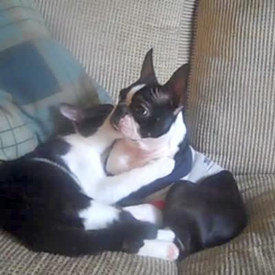 A matching cat and dog cuddle with each other on a couch indoors.