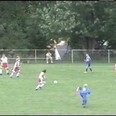 Boy plays goalie in a soccer match. He catches a ball but then runs head first into the goal post. Boy falls. No recovery.