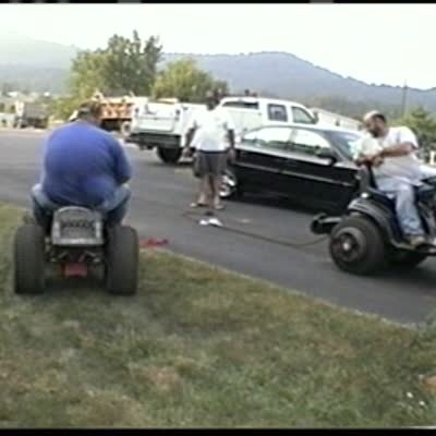 2 big men on lawn tractors play tug-o-war. Man falls back & is pulled across the pavement. They have 2 games / matches.