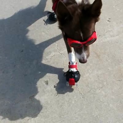 A dog wears goggles and matching roller skate shoes.