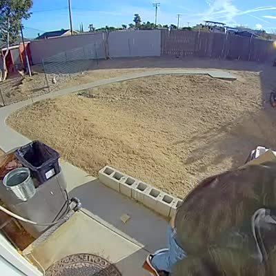 A man falls down in the yard when he tries to push trash down in the trash can with his foot. Security footage.