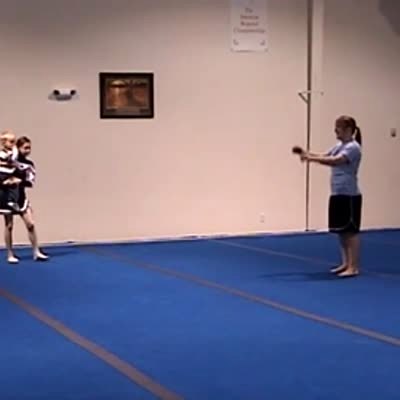 A young girl does a somersault down a mat in a gym and accidentally kicks a man in the groin at the bottom of the ramp.