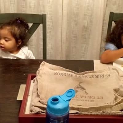 A young girl sits in a chair at the dining table and slips and falls off the edge and pulls the plate off the table as well.