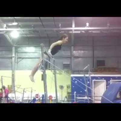 In a gymnastics gym, a teen girl swings from the uneven bars and crashes hard on another bar covered in a gym mat. No tails.