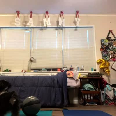 A woman does yoga in the living room and her dog pees on the mat, but she doesn't realize it and then lays down in it. No audio.