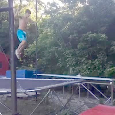 A teen boy jumps off of a trampoline, then misses the mat below him and falls head-first on the ground.