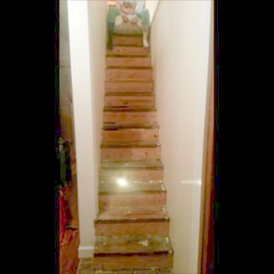 Tot boy walks up a flight of stairs. Another tot boy slides down the stairs on a mattress and knocks him over. Sideways video.