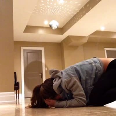 Girls do back flips on a small mattress indoors, practicing gymnastics. One girl tries a front flip and the blanket underneath her gets whipped over her face. The woman behind the camera laughs.