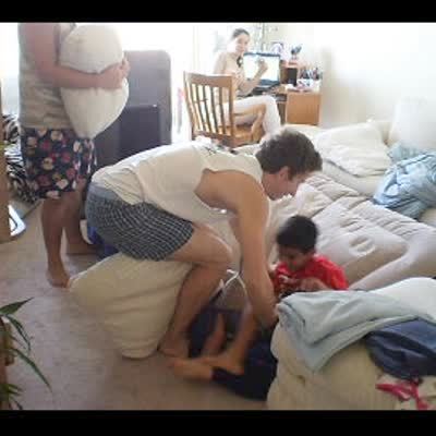 Dad launches 2 different little girls off an air mattress into another man's arms. Kids cheer. In the den, long for edit.