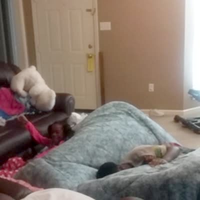 A teen girl jumps on an air mattress and launches a tot boy forward off of an air mattress. He hits a TV in cabinet, nearly knocking it over. The boy starts to cry and the teen girl ushers him out of the room. Two younger girls rush to return the room to normal.