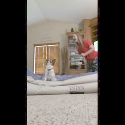 Dog sits on inflatable mattress. Dog flies into the air when girl jumps on mattress.