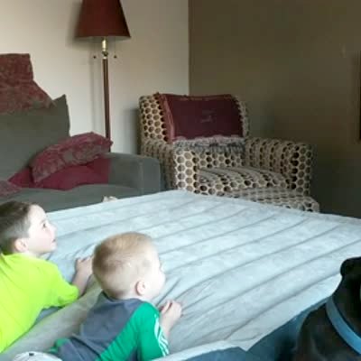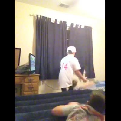 Teen boys jump on a bed, causing friend to launch off mattress and fly across the room