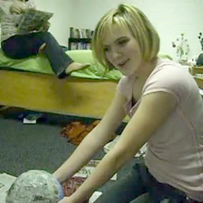 A teen girl tries to climb onto a top bunk bed in a cabin. The mattress collapses because the board underneath has been removed and the girl falls through. Practical joke.