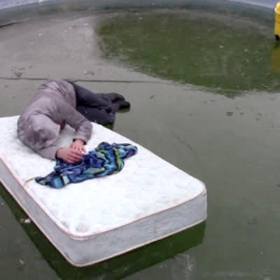 A man jumps on a mattress on a frozen swimming pool and hits his head on the ice.