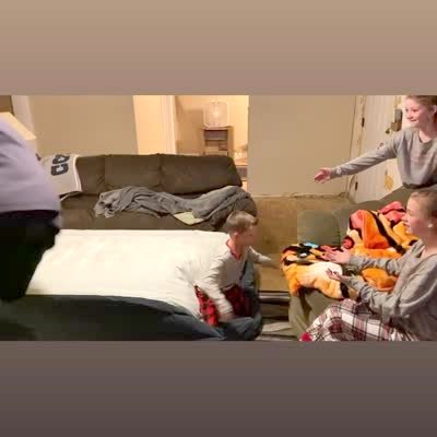 A boy repeatedly jumps on an air mattress in the living room and bounces a girl off of it and onto the couch. At 0:55, a woman jumps on the air mattress and launches the girl high into the air and she falls on her head.