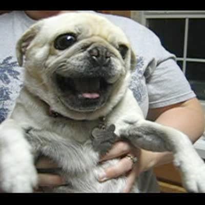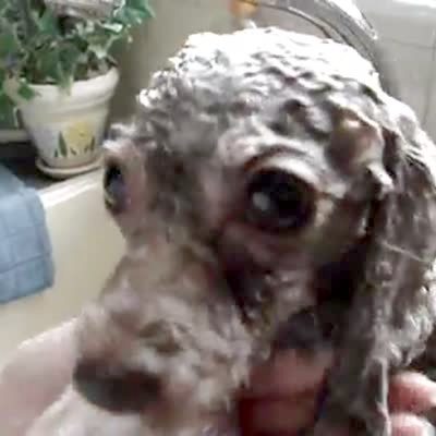 Dog growls and bares his teeth when man asks if he wants a bath, then tries to bite man's finger a few times. Angry, mad.