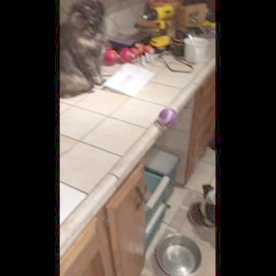 A cat sits on the kitchen counter and rolls a ball off the edge and it falls into a bowl of water and the splash scares a dog while it drinks from the bowl.