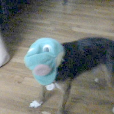 A small dog has a blue dinosaur puppet stuck on its head. It can't get it off, and it looks like its head is the dinosaur head.