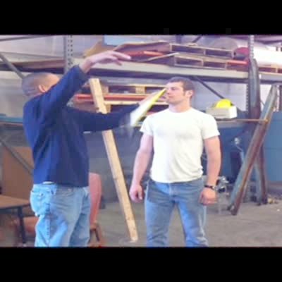 A man tape measures another man in a warehouse at work. He puts the end of the tape measurer on a man's face and holds the other end out away from his face. He lets go of the other end, it swings down, and hits the man in the crotch. Action in first 35 seconds.