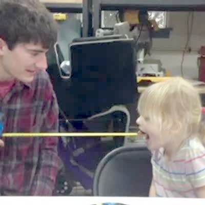 A teen boy repeatedly puts a piece of food on an electric tape measure, extends it, and a young girl eats it.