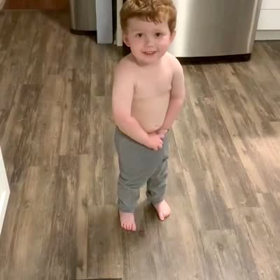 A tot boy sticks his hand in his pants in the kitchen and the man with the camera asks him what is in there. The boy says "a tape measurer" and then pulls the tape out from his pants and extends it up.