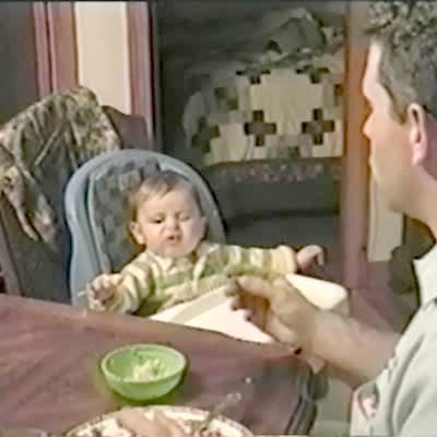 Baby boy in high chair. Dad feeds him. Baby hates his beans and rice, loves dad's meat loaf. Dad turns to the camera and says to wife, "See everyone loves your meat loaf"