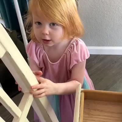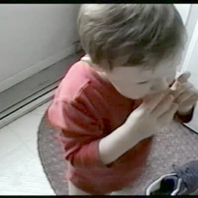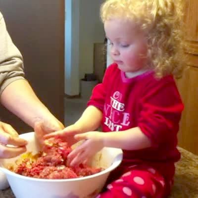 A tot girl sits on the kitchen counter and helps her grandmother mix hamburger meat. The girl throws some of the meat on the floor when her grandmother asks her to show her mother.