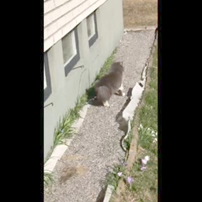 A cat walks alongside a house with a bag of meat in its mouth. When the cat sees the person with the camera the cat runs away across the yard.