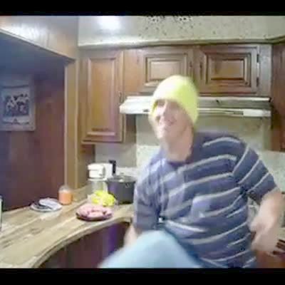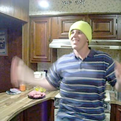 Teen boy in yellow ski hat makes a hamburger & throws it up to the ceiling, it sticks there.