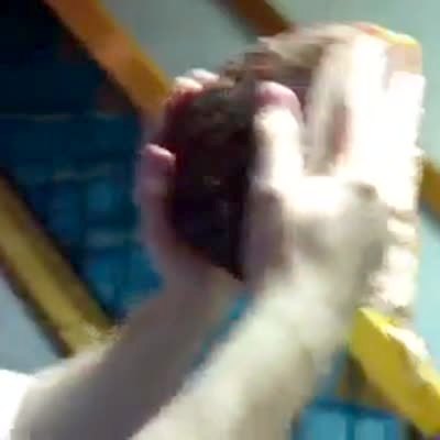 Man tries to punch a ham hock that friend is holding up in living room, ham flies and hits camera lens.