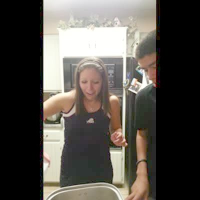 A teen girl indoors screams as she removes her new phone from the inside of a raw Thanksgiving turkey. A teen boy comments. A man and woman are audible.