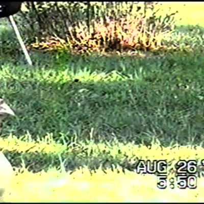 A man stands on a porch next to a barbecue grill, then a piece of aluminum foil is blown by wind off of a dish of food, and it covers his face. Security footage.
