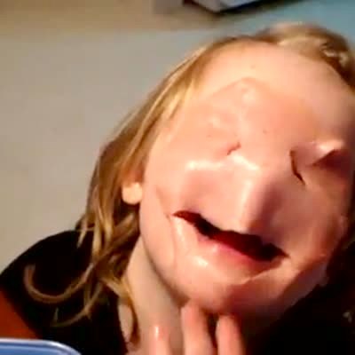 Young girl puts bologna over her face and eats through a hole to make a mouth. She also ate holes for her eyes to go through. Baloney. Funny face. Food.