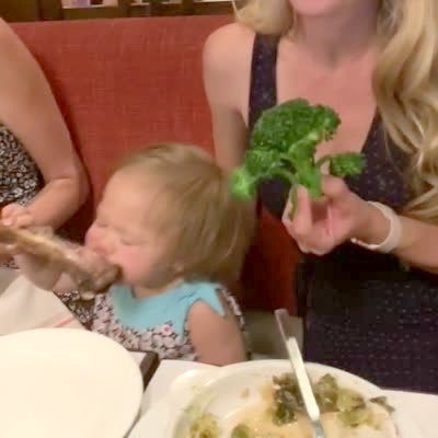 "Baby Likes Baby Backs" A tot girl eats meat off a rib at a restaurant while her mother sits next to her and says to the camera, "Okay, so I don't think she's going to be a vegetarian like mom". Featured talent cleared only (two women in the b.g. of the restaurant are *not* cleared).