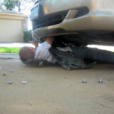 Two men lay under a car in the driveway and work on it. A goat jumps on one of the men. It lands on his groin and he yells.